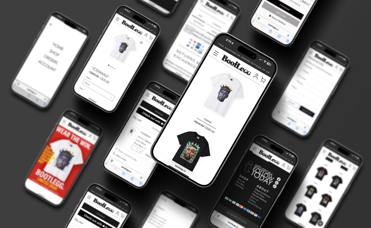On the web side, I had to strike a balance between bold brand expression and real functionality. Bootlegg’s identity is loud — by design — but the site still had to sell product. Navigating how to incorporate heavy visuals without sacrificing clarity or speed was a constant push-pull.